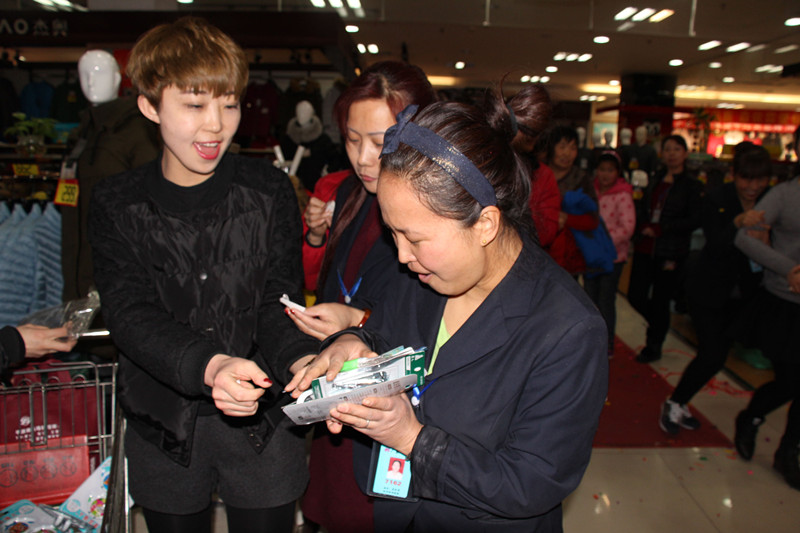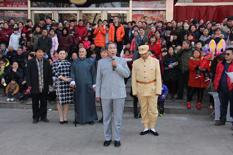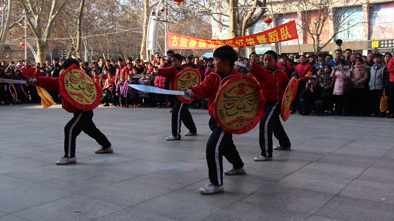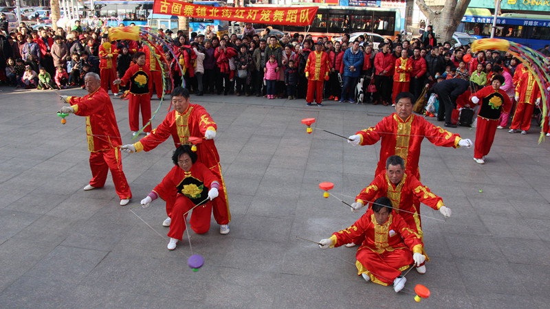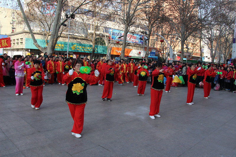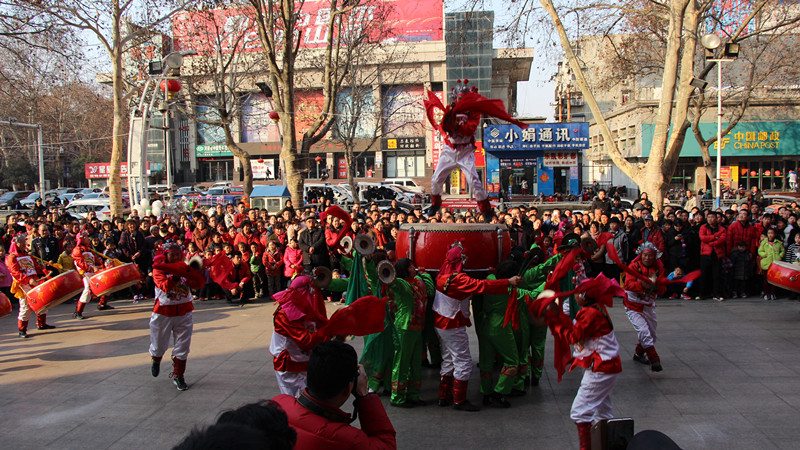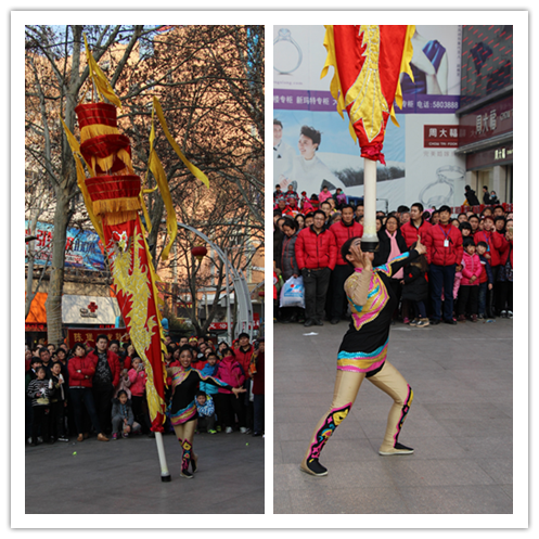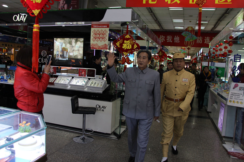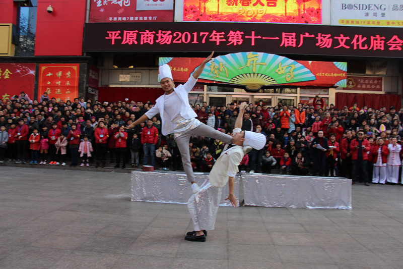 逛完了上午的民俗文化一條街,下午兩點,商場舉辦的第十一屆傳統(tǒng)文化廟會熱烈開場:《中州大鼓》、《喜慶大鼓》敲出新年滿堂彩;《舞龍》、《舞獅》舞出吉祥好喜氣;《二鬼摔跤》盡顯打斗憨態(tài);《鬧社火》中毛驢、旱船齊舞動,一派喜氣洋洋;平均年齡在六十五歲以上的《抖空竹》老年隊,展示出夕陽之美、運(yùn)動之樂;雜技轉(zhuǎn)碟《快樂廚師》轉(zhuǎn)出快樂節(jié)奏;燈籠舞《紅紅的日子》跳出元宵節(jié)喜樂節(jié)拍;商場員工親自參演的腰鼓《鑼鼓喧天》和歌舞《12生肖鬧元宵》盡顯平原真風(fēng)采……除了以上傳統(tǒng)民俗節(jié)目的精彩,廟會中還有新亮點:“中國女子中幡第一人”在商場廣場上瀟灑耍中幡,柔弱女子一根手指穩(wěn)穩(wěn)挑起百余斤重的中幡,引得在場觀眾喝彩連連,心生敬嘆;商場特別邀請到的扮演毛澤東、蔣介石的兩位特型演員到場與觀眾互動,為大家?guī)矸氯舸┰綒v史的現(xiàn)場感受。
