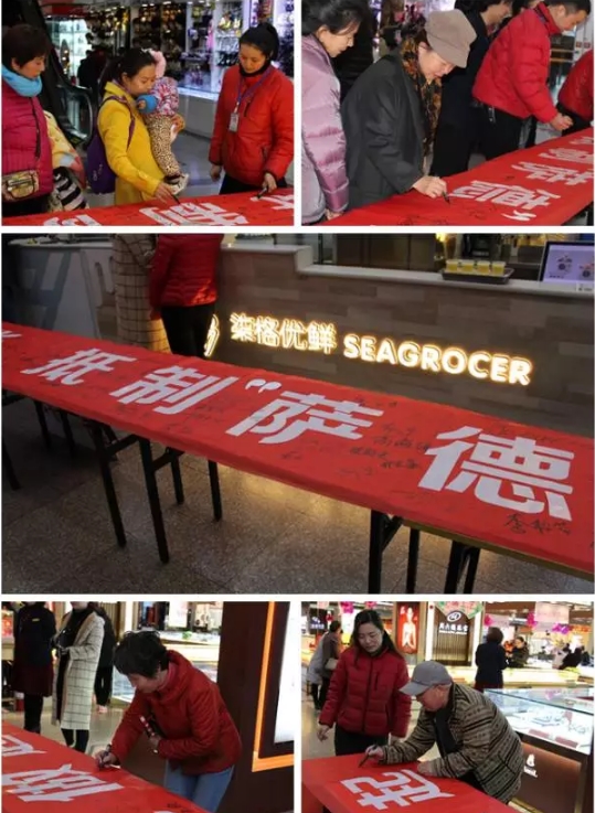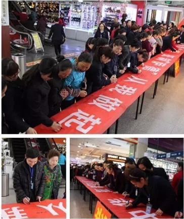 商場正常開門營業(yè)后,團委與宣教部聯(lián)合,又在商場一樓總服務臺處舉行愛國宣傳活動,向顧客、員工門宣講“薩德”對我們國家的影響,引導大家理性愛國、付諸行動。商場還特別印制“愛我中華,抵制“薩德”,從我做起”的巨型條幅鋪在宣傳現(xiàn)場,引發(fā)過往顧客及員工自覺提筆簽名,以表愛國心志。