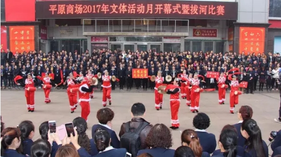 今晨7點(diǎn)30分,平原商場北門廣場人如潮、聲鼎沸,商場2017年春季運(yùn)動會在咚鏘有力的腰鼓節(jié)奏中激情開幕,三樓幾十名女員工一襲紅衣,揚(yáng)起一抹紅袖,敲起紅色腰鼓,盡展平原人精氣神,為接下來要進(jìn)行的拔河比賽助威漲勢。