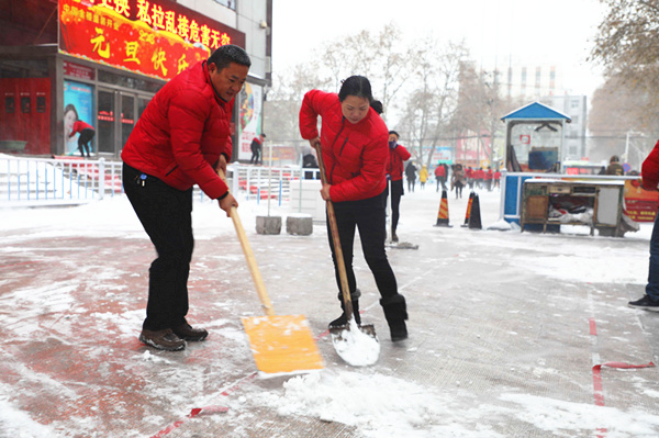 凜冽寒風(fēng)中平原人集體在廣場(chǎng)上掃雪,不僅給廣大的市民朋友帶來(lái)了行走的安全和便利,也給每一個(gè)平原人的心里注入了“團(tuán)結(jié)”的力量和商場(chǎng)主人翁的“愛(ài)家”動(dòng)力。當(dāng)《平原店歌》、《相親相愛(ài)一家人》等歌曲在廣場(chǎng)上來(lái)回飄蕩,當(dāng)商場(chǎng)各位領(lǐng)導(dǎo)和員工們一起揮锨掃雪的場(chǎng)景映入眼簾,平原人那一股由內(nèi)而外所散發(fā)出來(lái)的正能量和責(zé)任感,如同這工裝的那一抹平原紅一般,不僅耀眼奪目,而且彼此溫暖。大家在熱火朝天的掃雪中相互傳遞著快樂(lè)工作、快樂(lè)生活的“平原快樂(lè)之歌”,也將“大干50天,銷(xiāo)售突破1.5億元”的干勁兒和信心激勵(lì)的更加蓬勃、旺盛。