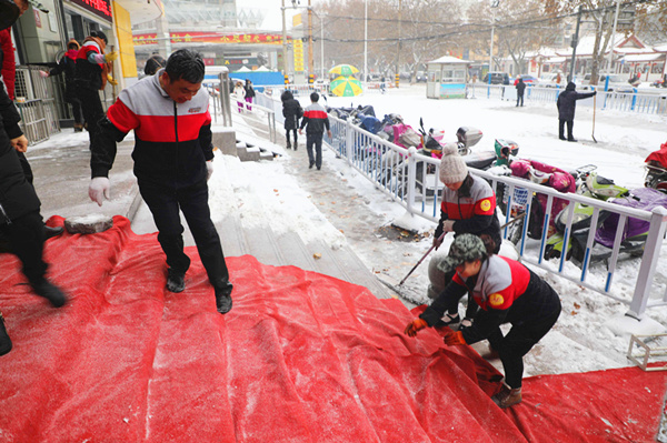 早晨7點(diǎn)多,平原人就早早的踏雪而來(lái)。雪大路滑,為了不耽誤正常工作,大家都提前很長(zhǎng)時(shí)間離開(kāi)溫暖的小家,走在上班的路上。到達(dá)商場(chǎng)后,大家沒(méi)有絲毫停留,換好紅色的羽絨服工裝,拿起清掃工具就趕往商場(chǎng)廣場(chǎng),來(lái)赴2018年的首次“平原之約”。這個(gè)傳統(tǒng)和不成文的約定,就是每逢下雪的天氣,只要室外有積雪,平原人都會(huì)自覺(jué)到商場(chǎng)廣場(chǎng)清掃積雪,在臺(tái)階上鋪設(shè)防滑地毯,最大程度的為廣大顧客和行人帶來(lái)安全和便捷。