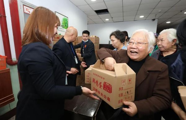 聯(lián)歡會(huì)結(jié)束后,商場(chǎng)為老職工們特別準(zhǔn)備的“暖心重陽(yáng)禮”——5斤鮮雞蛋與退休貢獻(xiàn)津貼如約送上。老職工們有序的排隊(duì)領(lǐng)取,幸福的笑容蕩漾在每個(gè)人的臉上。