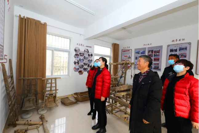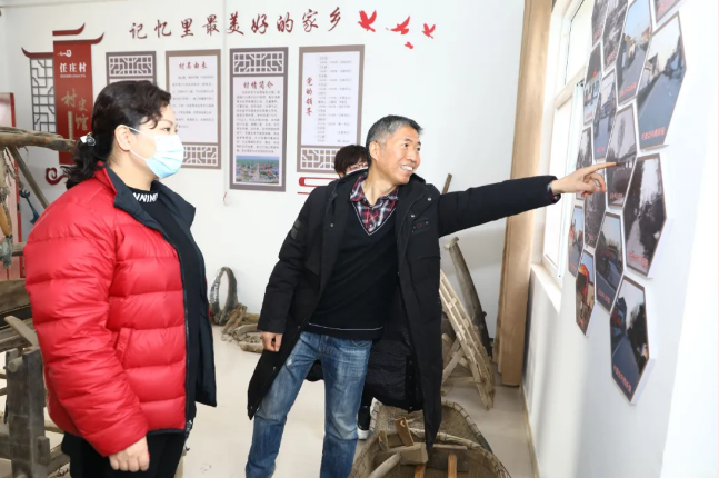 活動中心走廊的盡頭,是村里的文化館,館內(nèi)陳列的織布機(jī)、早年農(nóng)作工具等老物件都是村民們捐過來的,周圍的墻壁也變成了任莊脫貧致富的宣傳陣地。在這里,他們將村子的舊貌新顏、村民的文化活動、助力任莊脫貧的企業(yè)、人員事跡等一一記載和宣揚(yáng)。