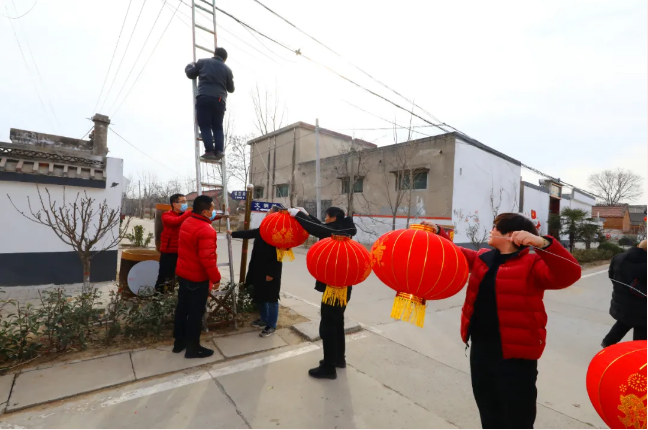 朱總一行人給愛心超市送去日用品后,便趕到街道上與村民和孩子們一同撐燈籠、掛燈籠。大家有說有笑,其樂融融,回“家”的暖意瞬間涌上心頭。人多力量大,很快,一排排大紅燈籠掛滿了任莊村的各個(gè)街道、路口,點(diǎn)點(diǎn)紅色的裝扮為冬日村莊增添了生機(jī)和活力,濃濃的新年氣息撲面而來。
