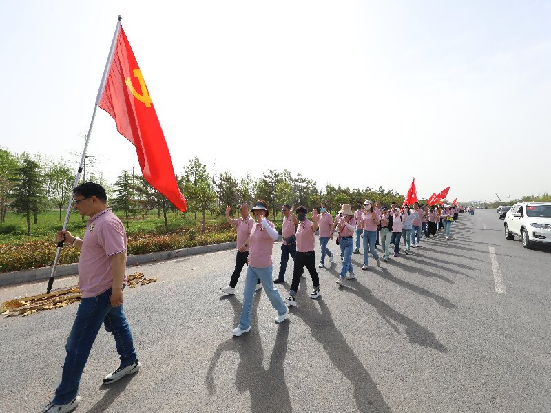 隊(duì)伍穿梭于綠意盎然的鄉(xiāng)間大道,暖陽(yáng)斜照,歡聲笑語(yǔ)不斷。一字排開(kāi)的龐大隊(duì)伍如巨龍般傲然向前,高高舉起的隊(duì)旗迎風(fēng)招展。有人和著音樂(lè)健步向前,有人結(jié)伴并肩暢聊生活,更有員工主動(dòng)承擔(dān)后勤保障,與隊(duì)員們一路隨行同進(jìn),展現(xiàn)出平原人的團(tuán)結(jié)風(fēng)貌。